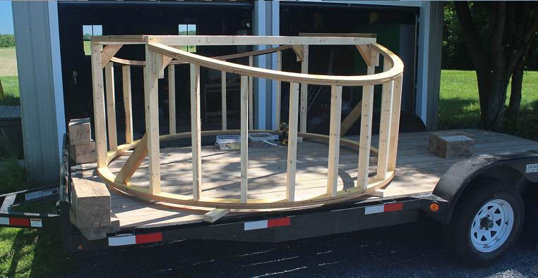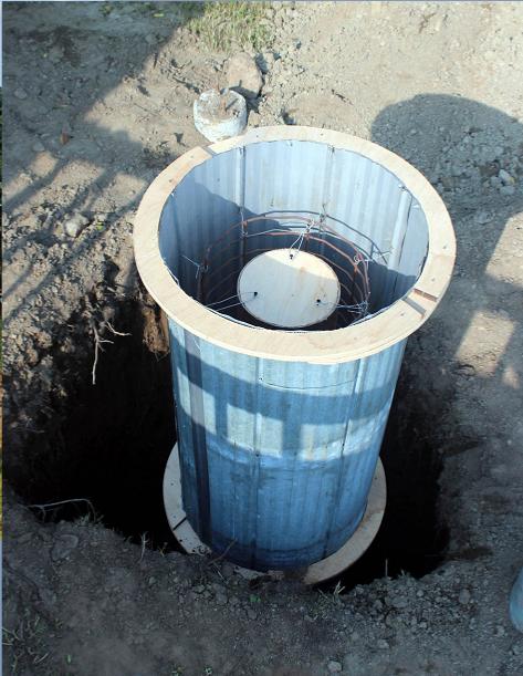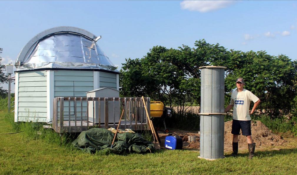 I chose a 21" pier with a 9" hollow. To reduce cost, I built a casing out of roof tin and used a rolled grid for armouring I had found on a rock pile. 34 bags of 30 kg mixed concrete in all for the footing and pier. The lower dome sits on three concrete posts, and have cantilevered joices. Galvanized tin wraps around the building. The same tractor that moved the first dome 30 kms was used again to lift the turret onto the buiding. The car hauler was used to both build the turret and deliver it to the site as it was the only flat surface on the farm!
