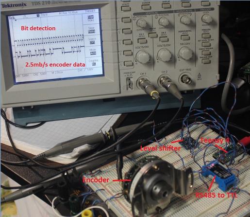 Faced with 250$ for a second OpalKelly fpga PCB for reading the encoders as I had on the other telescope, I decided to use a Teensy 4.0 as it had a 600 MHz ARM,surmising I'd have better than 100 steps of granularity per bit of the 2.5 Mbs serial stream from the Tamagawa SmartAbs encoder. First time using a Teensy + Arduino IDE, one afternoon, voila! Didn't waste time making circuits, also got an RS485 to digital converter, and a 3.3V to 5V level shifter. Snap easy nowadays! 35$ in all.