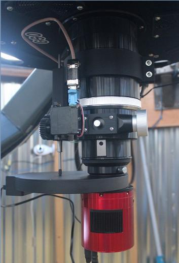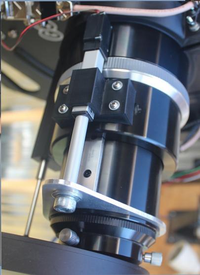 The GSO 3" focuser isn't known for carrying much weight - the focus apparatus is housed in plastic parts. One end had no centering bushing, so the shaft would no longer run true at high weight. I added a bushing and it solved the problem. I also made a 3D conforming part and gears to allow a hobby servo to turn the focus knob. A USDigital 0.0005" per step plunger encoder provides focus position feedback. Nice! ...then I scrapped that and replaced the 10:1 focusing with a linear actuator so that it could support a heavy image train - arguably the only such design on the web! The GSO focuser can now handle 6kg of image train with no significant flexing.